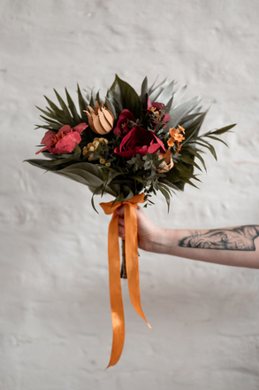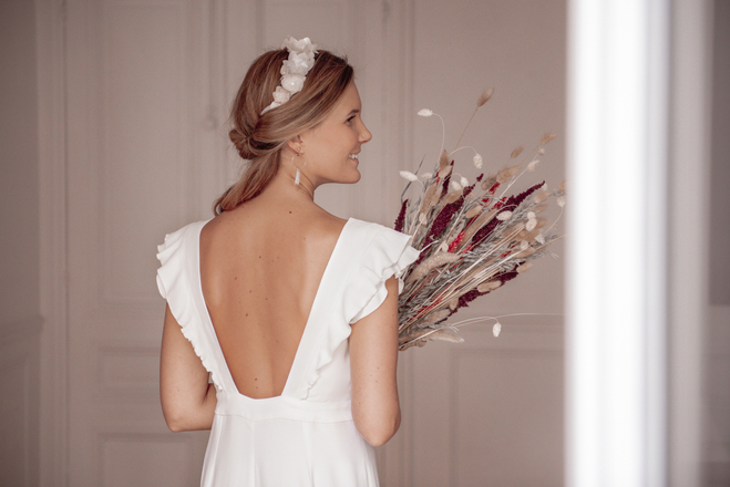 Le bouquet est une création à 4 mains avec Flower by Mariette mêlant fleurs de papier et feuillages naturels.